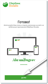 6. Регистрация в приложении "Сбербанк онлайн" завершена успешно! Для продолжения работы - нажмите "Далее".